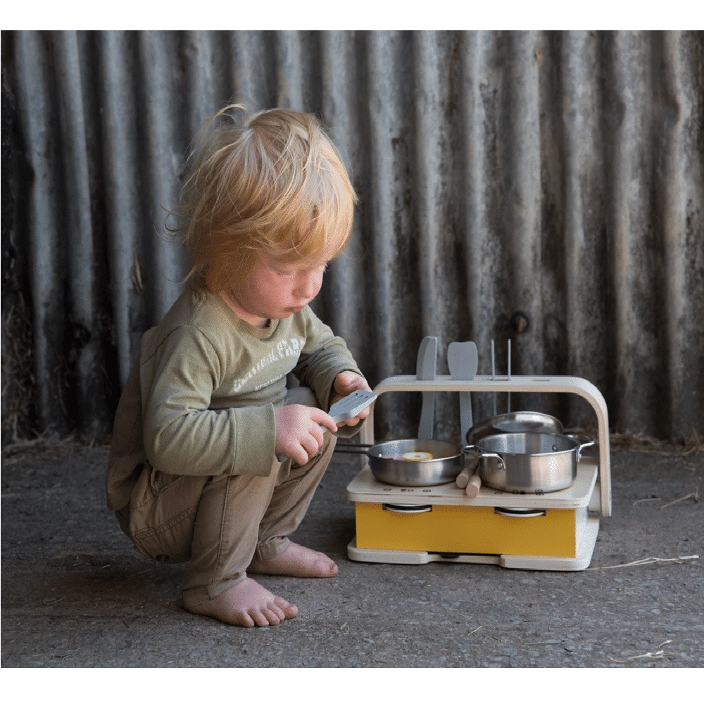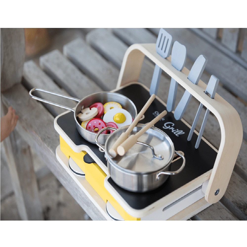 This kitchen comes with all the trimmings β metal frying pan and sauce pan, tongs, knife, spatulas, it even comes with skewers and vegetables to inspire the ultimate creativity! Move the utensil holder when itβs time to tidy up and use as a handle for storage / travel.