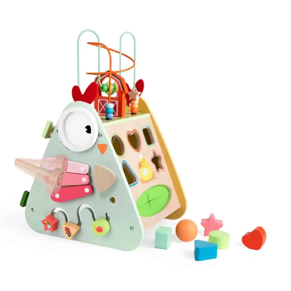 - This happy hen activity box includes multiple different functions, such as a xylophone, maze, bead coasters, shape sorters and many more to entertain little ones