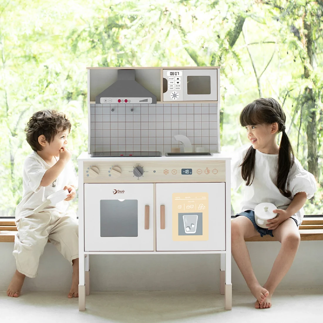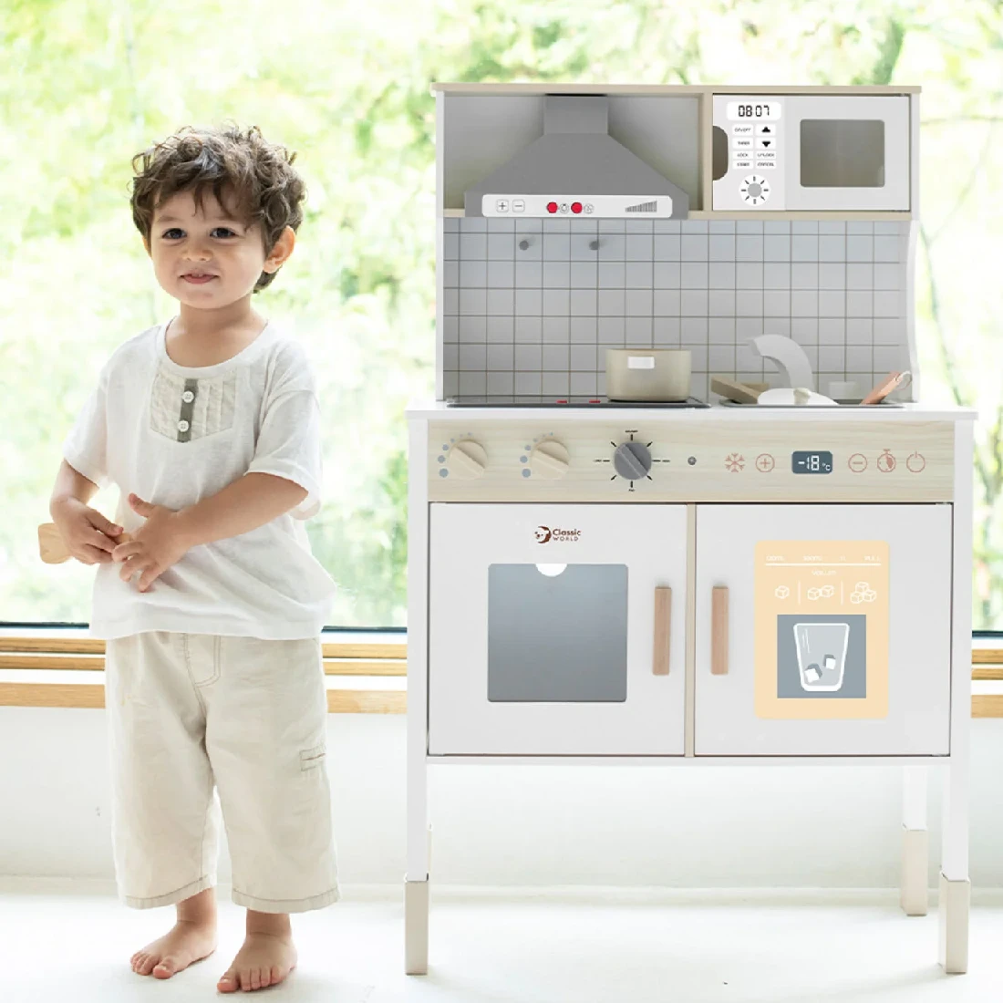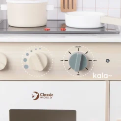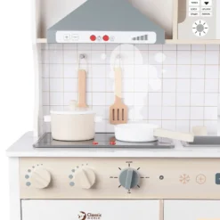 This beautiful,Classic World Modern Kitchen is the perfect way for your little ones to be introduced to the kitchen. It has all the essential components of a modern kitchen to help provide hours of enjoyment. It includes a microwave, oven, sink and cooking accessories. It also has hobs that light up and sound effects of the cooker hood and cooking ingredients to really encourage your child’s imagination. Children can have the full experience of becoming a chef with this wooden toy.