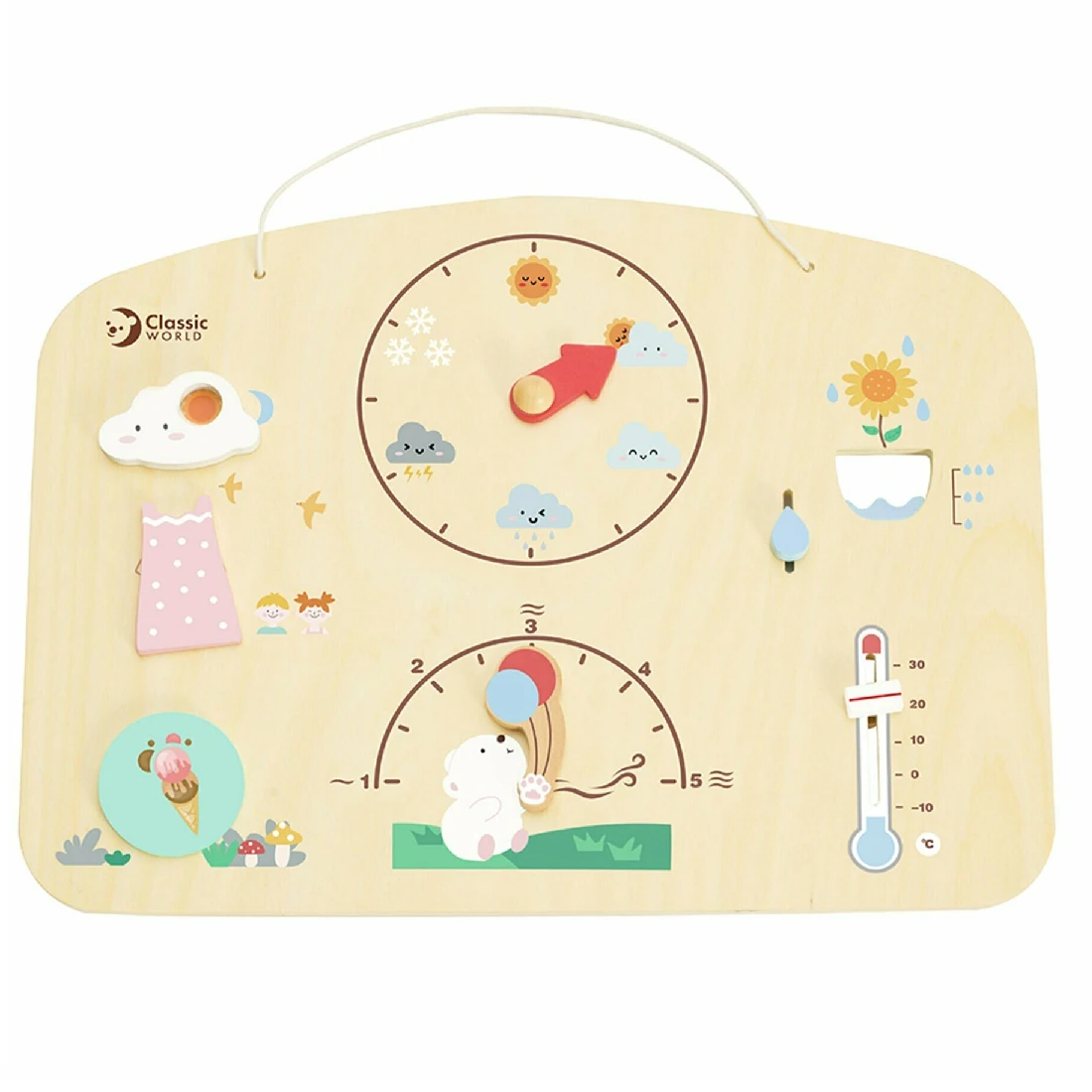 From sunshine to thunderstorms and Summer to Winter, this interactive Classic World Wooden Barometer board has it all. Whatโs the weather right now? The temperature and what clothes match it? Or how about the season? Your youngster can learn more about nature as they have fun with the 9 piece creative set that also helps them form connections between different settings and objects.