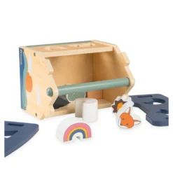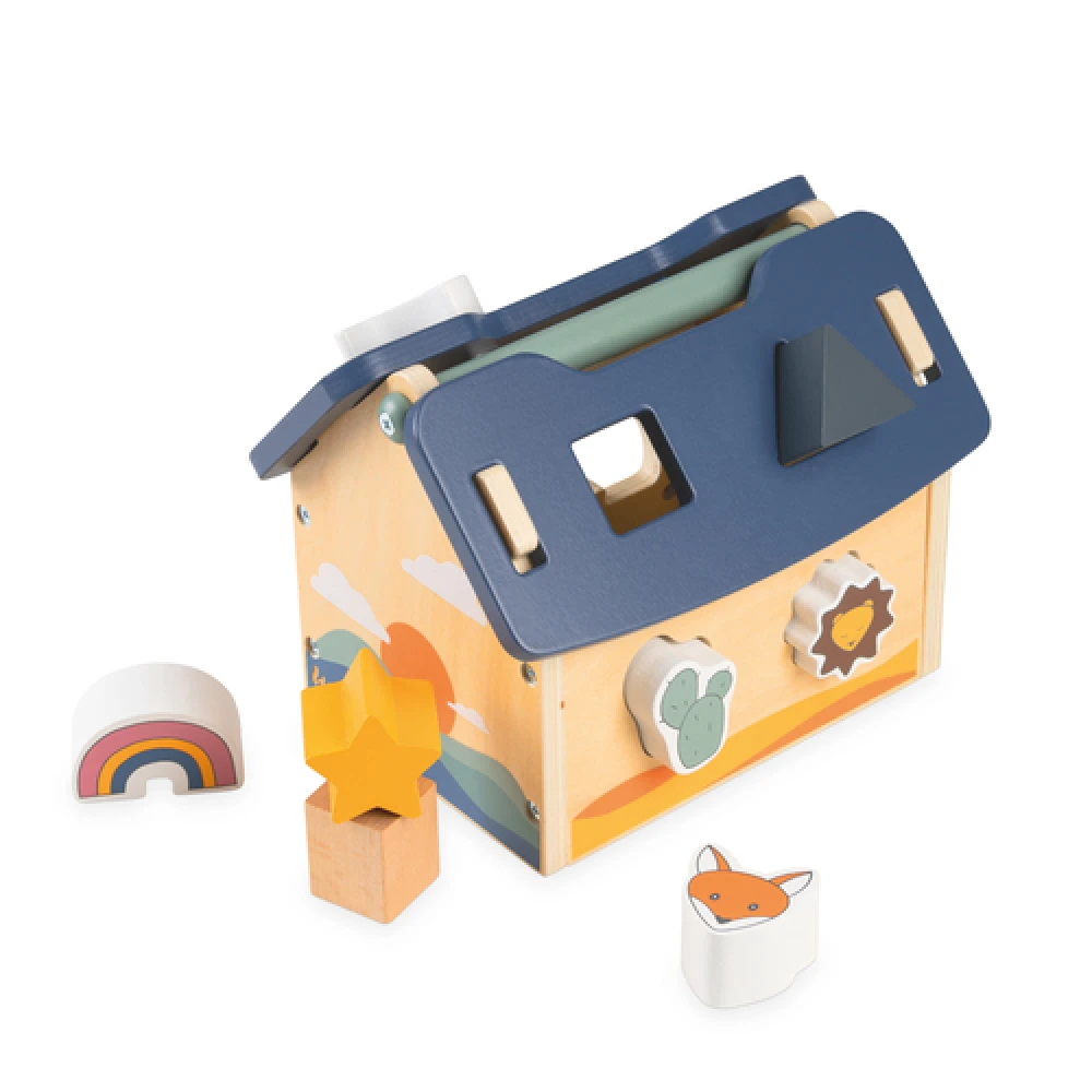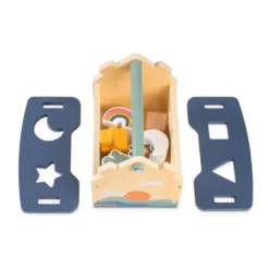 With the roof removed, your child can carry the house by the practical handle and take it anywhere. For storage, your child can open the roof and store all elements inside, having everything neatly stored and quickly ready for use again. The wooden sorting toy is suitable for children from 12 months onward.