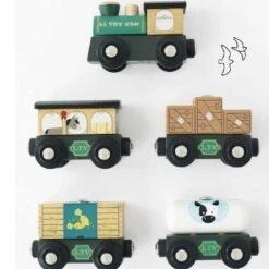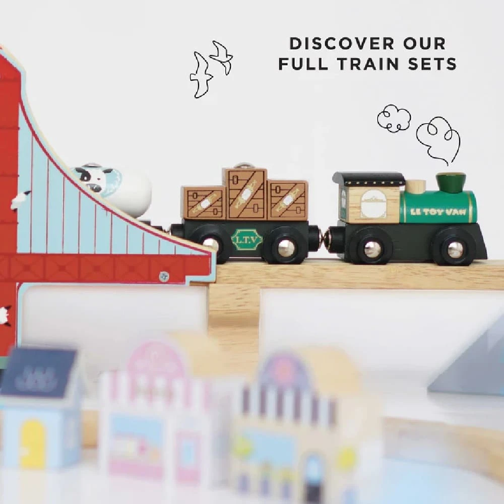 This beautiful, handmade Le Toy Van Great Green Train is ready and waiting for adventures and makes a great addition to any wooden train set.ย A perfect toy for encouraging creative play, this travelling goods locomotive will whisk little ones away on a journey of imagination, as it makes itโs essential deliveries.