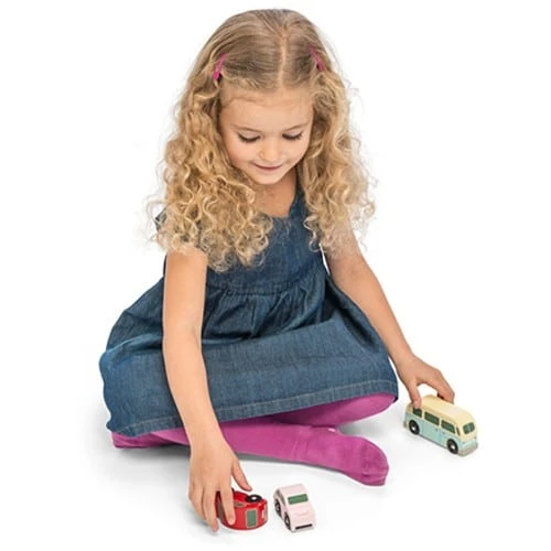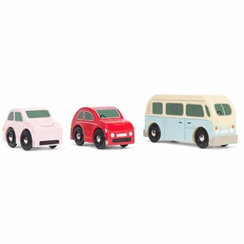 Painted in soft pastel shades, this eye catching set features two retro style cars and a camper van and is sure to inspire may hours of interactve play. Scaled to fit our wonderful range of Le Toy Van garages and playmats (train track compatible). An award winning toy would make a charming gift or stocking filler surprise.