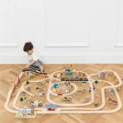 - 180 piece wooden train set featuring 2 trains, track and many accessories