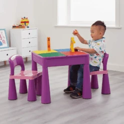 This kids activity table and chair set comes with a reversible tabletop, one side is smooth for writing, eating, playing, and doing homework. Flip the tabletop over for a construction tabletop, perfect for little ones who love to build. All our construction tabletops are compatible with the leading building brick brands.