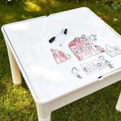 The kids 6-in-1 multipurpose activity table set comes with a red top that doubles as a protective table cover and provides a smooth surface for reading, playing with toys, or even mealtime. Supplied and stored underneath the red table cover is a reversible tabletop – chalkboard on one side and a white dry-wipe surface on the reverse – perfect for writing and drawing.