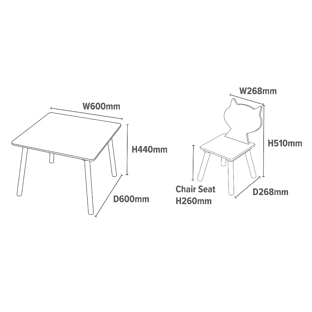 The fox and squirrel table and chair set comprises of a white table and our adorable fox and squirrel pair of chairs. The perfect setting for playing, reading, drawing, doing homework, and even eating. The stylish and subtle finish really will become a standout feature in your kid’s bedroom and playroom.