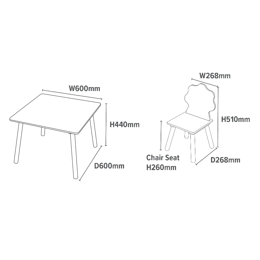 The tabletop is made from sturdy wood with solid pine wood legs for extra stability. Pinewood is known for impact resistance and so is perfect to withstand the rough and tumble of the playroom. Here, children are the key focus of everything we do. You can rest assured that your children will be safe and comfortable. The tabletop has a lacquer coating to protect against scratching, and as a result, it is easy to clean by simply using a damp cloth. With rounded corners for additional safety.