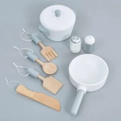 Includes opening oven and dishwasher doors and clicking dials. Four utensil hooks, a sink with a moving faucet tap, two printed induction burners. A small shelf, and a clock with rotating hands so your little chef can keep time. Includes 8 accessories, a wooden pot with lid, a pan, 2 spatulas, a spoon and knife, and salt and pepper pots.