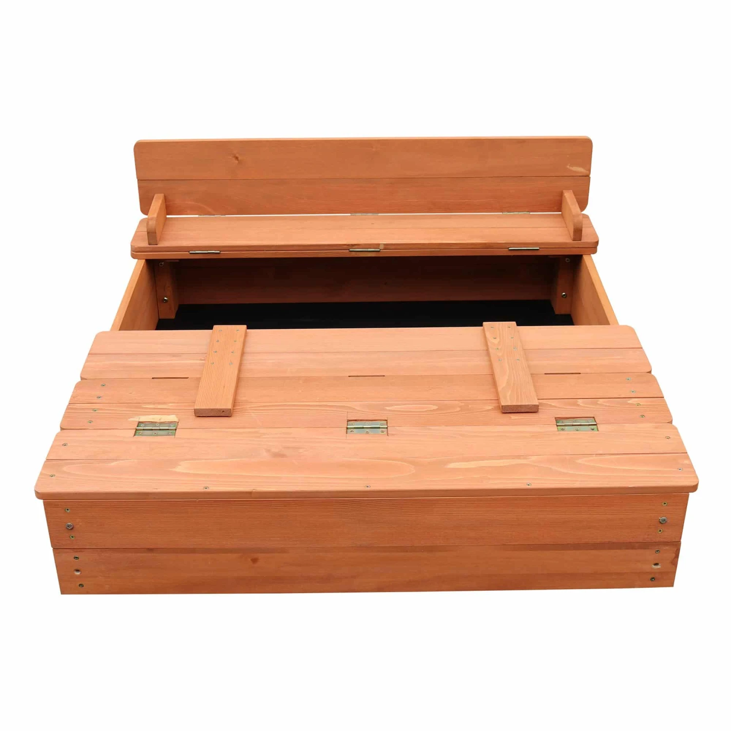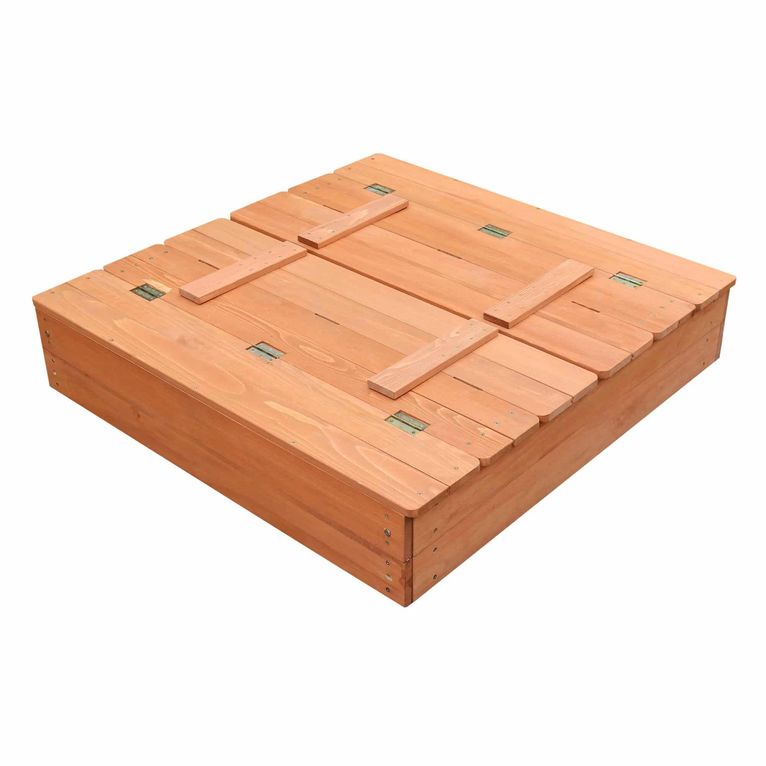 Our sandpit with seating has a dual-purpose top ā either folds into useful seating so that children can sit and play above the sand or when sand play is finished the top converts into a closed cover.
