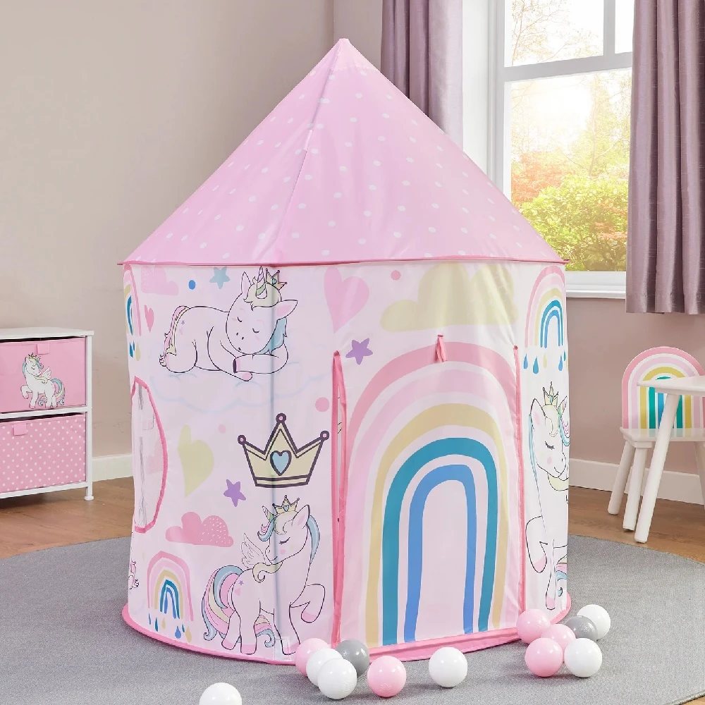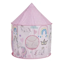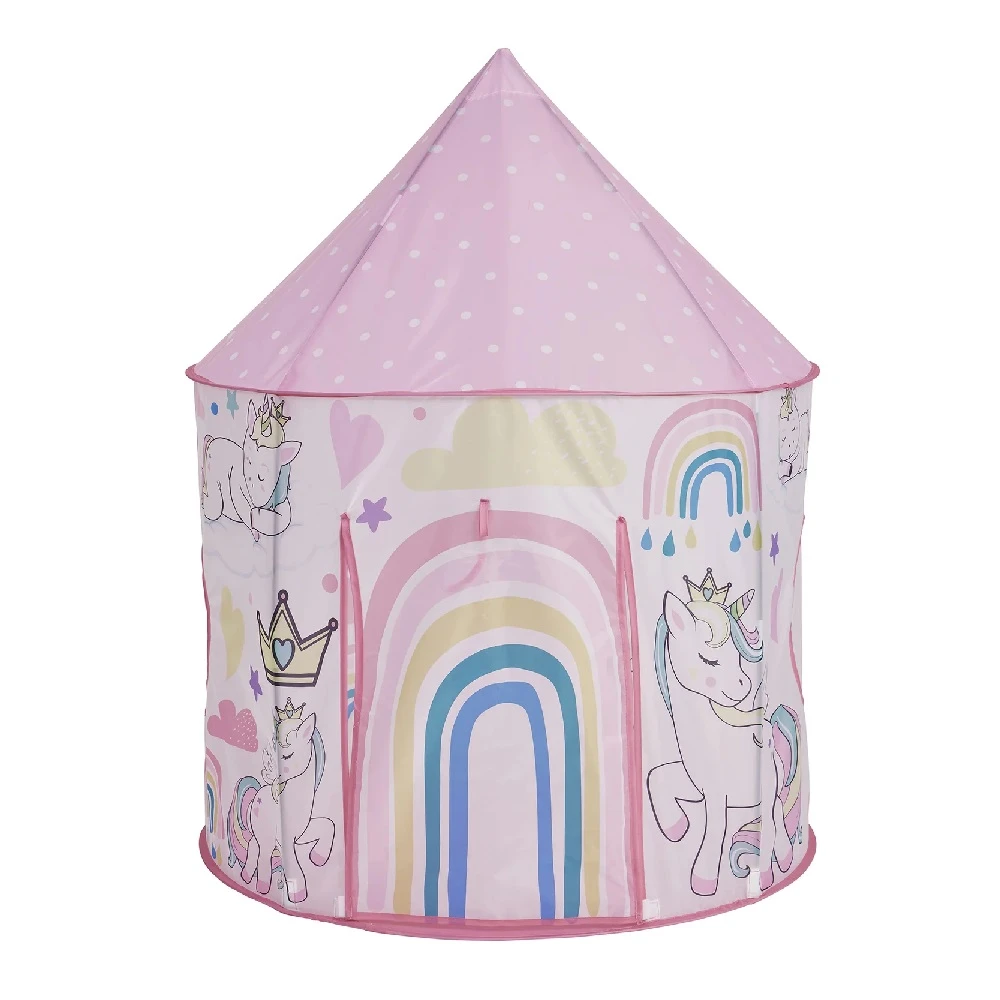 - Kids Unicorn Play Tent is made of polyester and fibreglass pole with steel wire, and it comes flat packed with easy-to-follow assembly instructions. Item includes storage bag for when you want to fold it away.