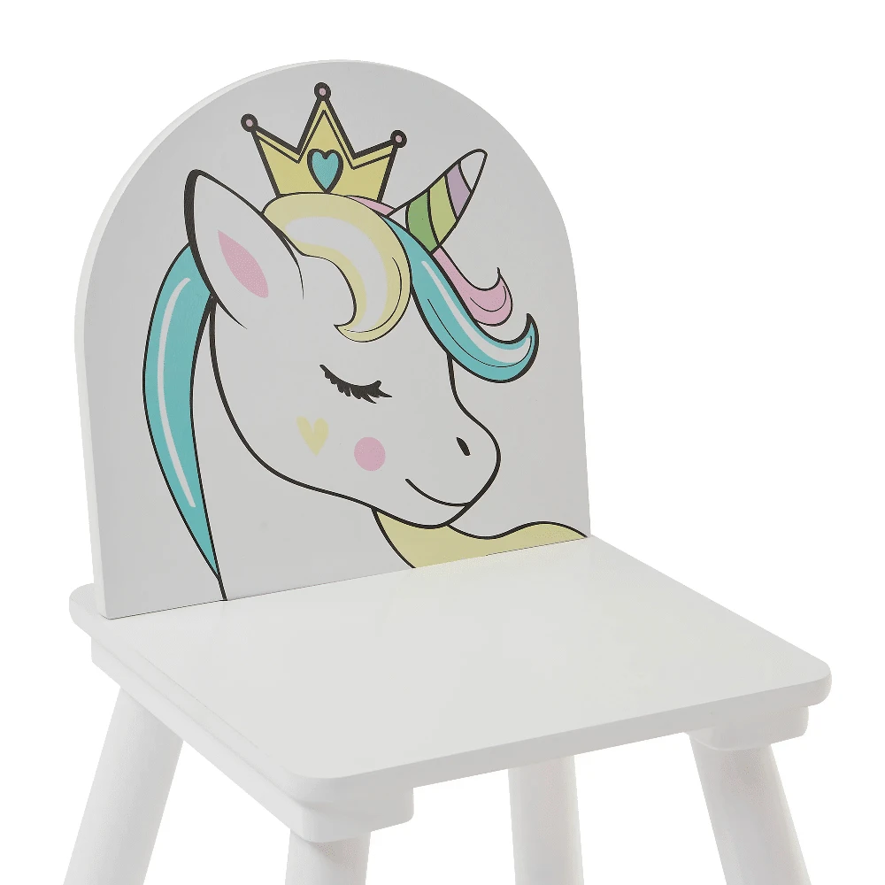 The unicorn table and chair set comprise of a white table and one chair has our lovely unicorn and the other chair has a rainbow. The perfect setting for playing, reading, drawing, doing homework, and even eating. The stylish and subtle finish really will become a standout feature in your kid’s bedroom and playroom.