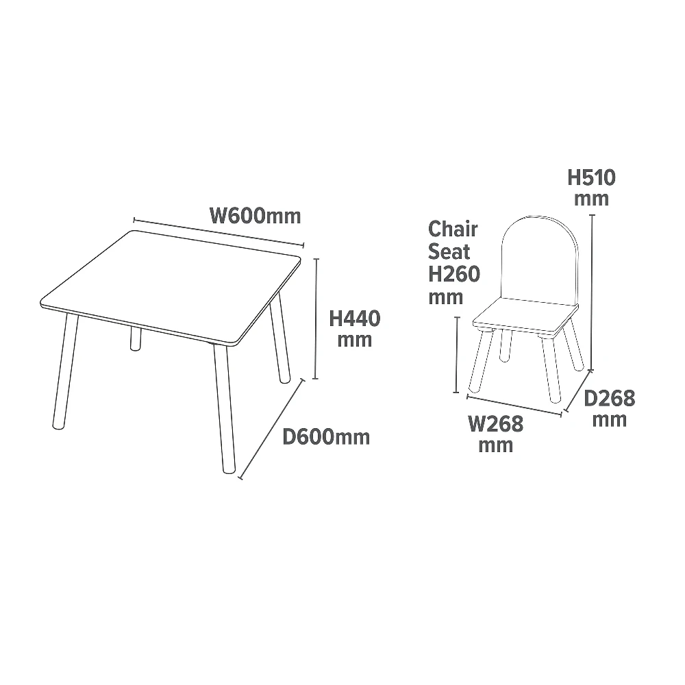 The table top is made from sturdy wood with solid pine wood legs for extra stability. The legs also have a hardwearing vinyl wrap for added protection. All corners are rounded for safety and comfort. Supplied complete with 2 chairs so a friend or sibling can join in the fun too.