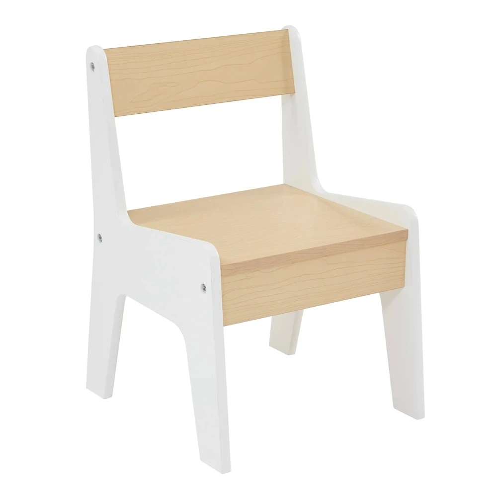The wide tabletop surface provides for plenty of reading and play space for children’s books and toys. White and natural wood look will fit the décor of any playroom or bedroom.