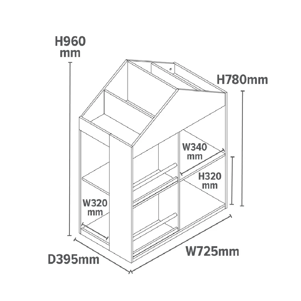 Two shallower shelves with retaining rail for books measure H320 x W345mm. Comes complete with a small chalkboard area where your little one can practice drawing and writing – or they can just apply their own decorative touch to this smart unit.