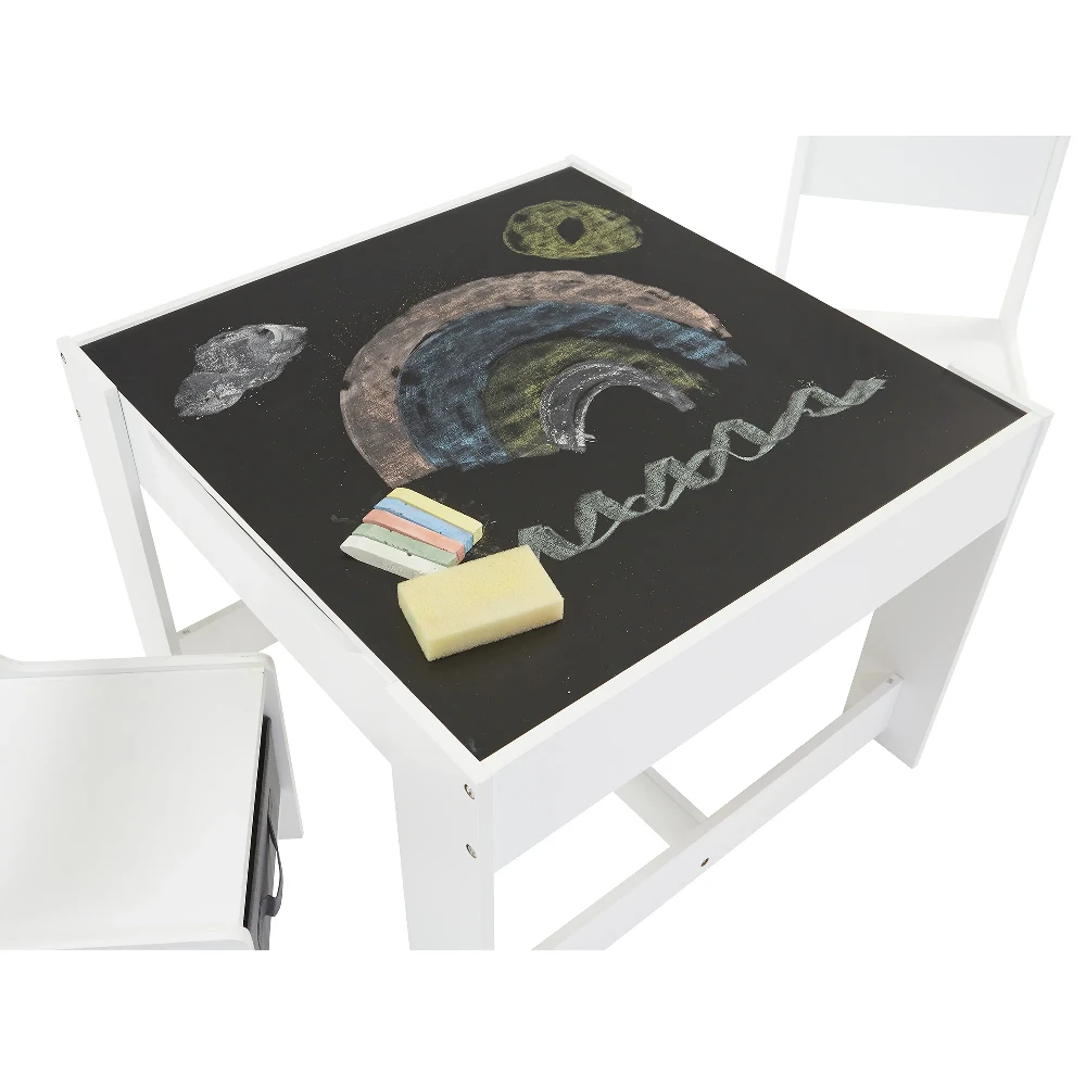 The table has a smooth white side which is excellent for your little ones to play, draw, eat, and do homework. Then with the handy cut out holes, little hands can effortlessly turn the tabletop over to reveal a chalkboard. Children can draw and write and practice their art on the way to becoming the next Picasso. When playtime is finished the table base can be used for storage.