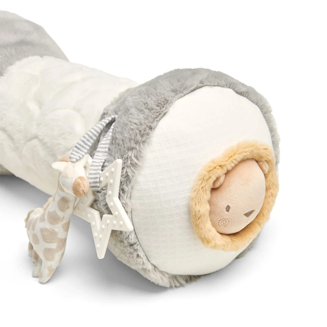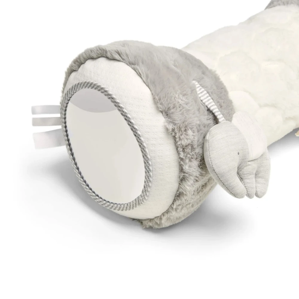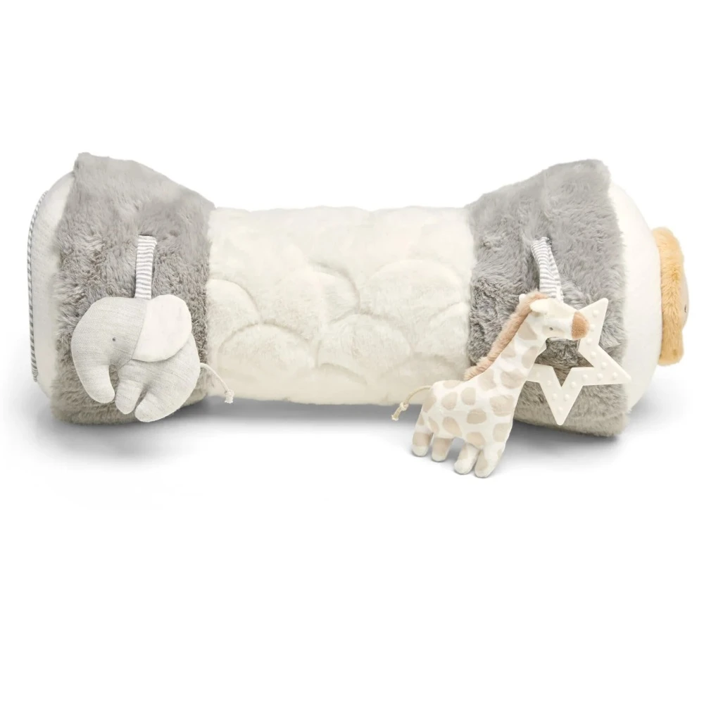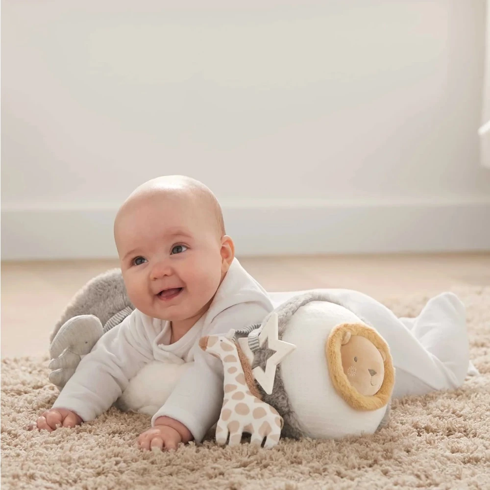 This delightful tummy time roll features a chime, crinkle, baby safe mirror and a rattle.Β This will provide a full sensory experience.Β In stylish neutral grey and featuring charming soft animal characters β an elephant and giraffe β for little ones to love,