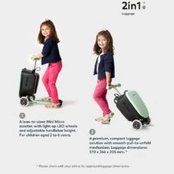 Mini Micro Scooter Suitcase and Light up Wheels β Mint is set to be a huge hit with explorers. The large 13-litre capacity is luggage approved. Big enough to pack your holiday essentials, including books, games and even a teddy. This can come with you on the plane.