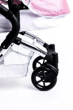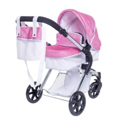 This single dollβs pram has 2-in-1 fabrics with poppers that allow you to convert the carrycot into a seat unit easily. The pramβs carrycot/seat unit and the changing bag included are covered in a shimmering pink and white design to stand out in the crowd. The bundle also includes matching carrycot apron and under seat basket where your children can put all baby-doll essentials.