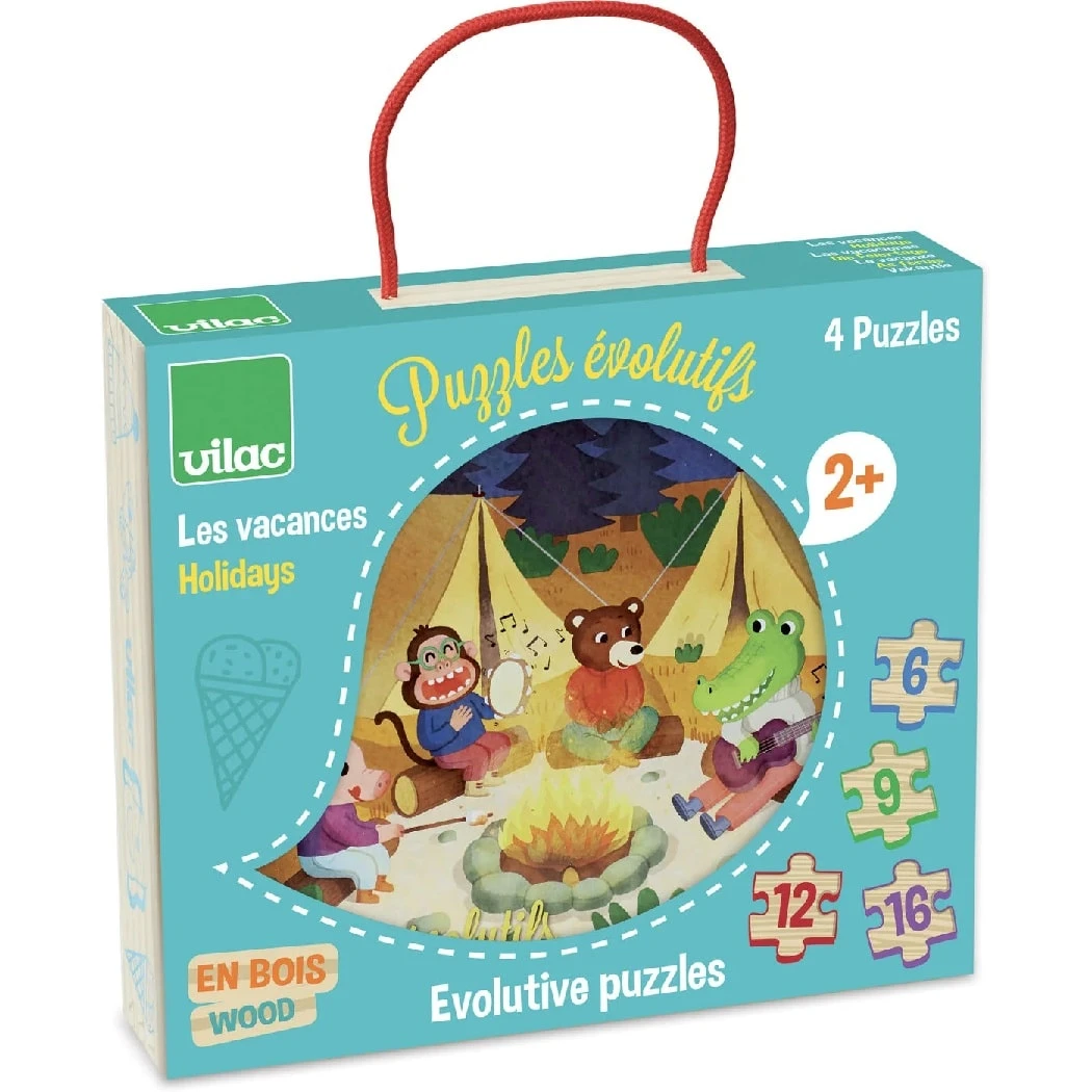 - The 4 Holiday Evolution Puzzles from Vilac increase in difficulty, with the number of puzzle pieces increasing (6, 9, 12 and 16 pcs).